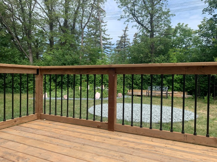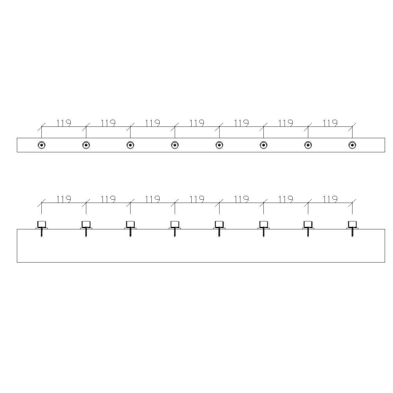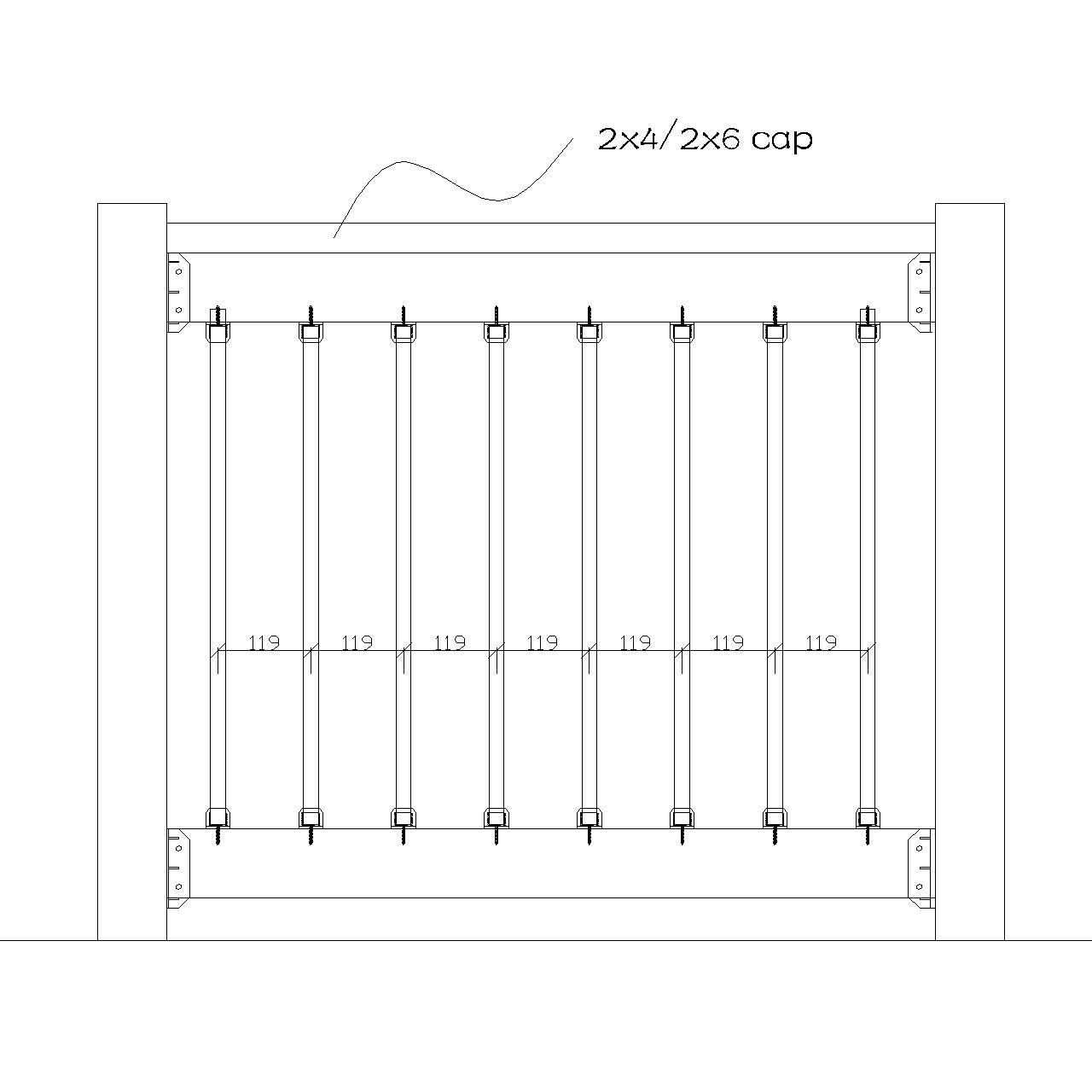- Align the wood base rail and handrail, and mark the positions for the balusters. For stair, ensure the spacing complies with building codes, maintaining a maximum center-to-center distance of 5.23 inches (133 mm) between balusters. For deck, the maximum center-to-center distance is 4.68 inches (119 mm). According the building code, the spacing between balusters can not be greater than 4 inches.